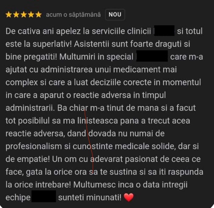 Mi-a plăcut că a fost atentă la fiecare detaliu din lunga mea recuperare de aproape 5 luni, până să o întâlnesc, apoi mi-a explicat fără să se grăbească cum și de ce să respect întocmai pașii indicați și mi-a oferit suport în îngrijirea acasă repede, pe whatsapp. Pe lângă asta, am mai apreciat că a înțeles disperarea mea și urgența unui consult și am stabilit o programare într-un timp foarte scurt.